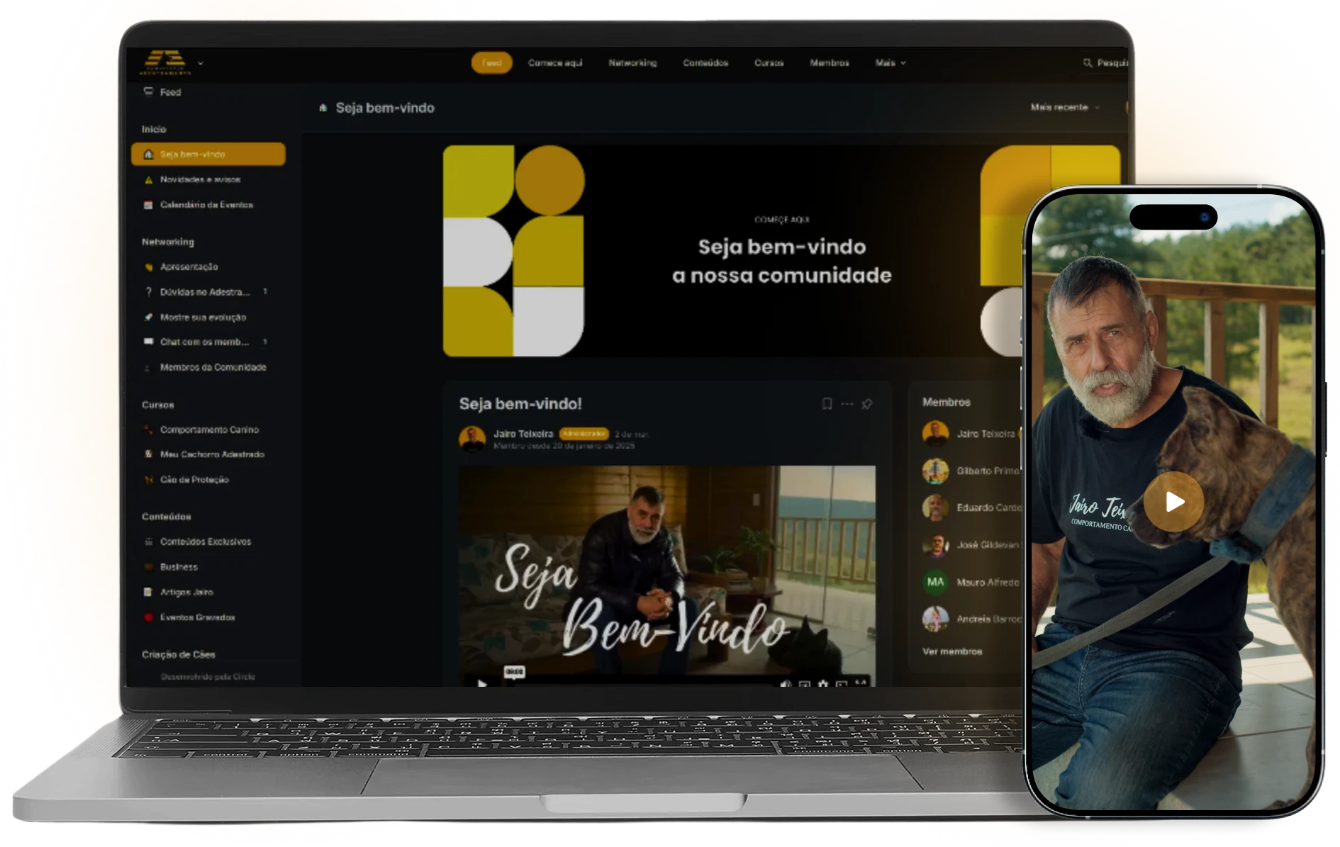 A Comunidade Adestramento é um ambiente exclusivo onde você tem acesso a cursos, mentorias e uma rede de networking com outros profissionais e apaixonados por cães. Você pode acompanhar as aulas no seu ritmo e participar das interações com Jairo Teixeira e os demais membros.